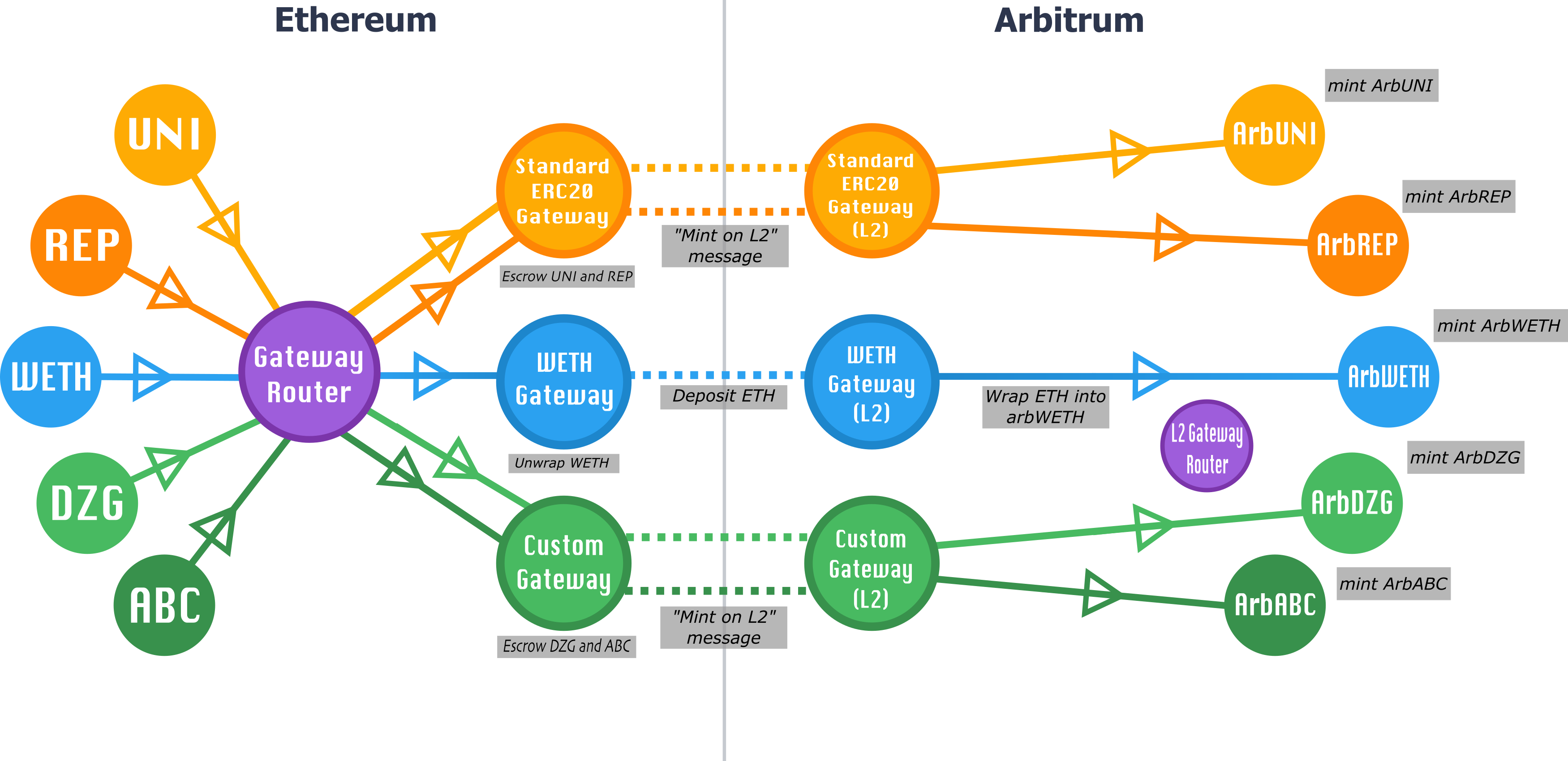 ERC-20on the parent chain and it's counterpart on Arbitrum. - Gateways: Pairs of contracts (one on the parent chain, one on the child chain) that implement a particular type of cross-chain asset bridging.